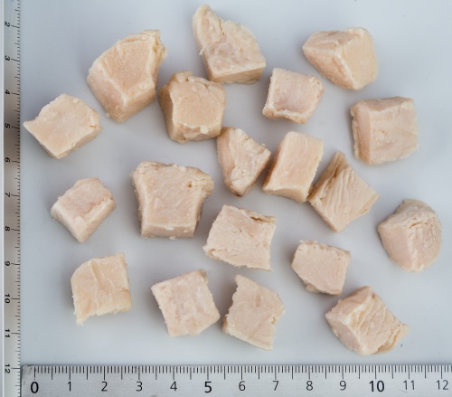 Suculenta pechuga de pollo, cocida y cortado en dados. Listo para comer en minutos, como pieza central de una deliciosa cocina, desde curry hasta ensaladas y salteados.